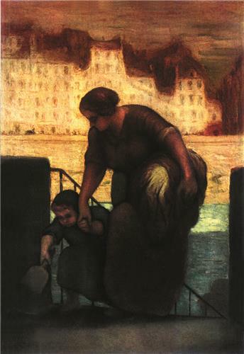 Daumier, Honoré, francuski slikar, grafičar i kipar (Marseille, 26. II. 1808 – Valmondois, 10. II. 1879). Živio u Parizu; u slikarstvu samouk; jedan od najplodnijih crtača XIX. stoljeća; izvrstan litograf (oko 4000 litografija u mnogobrojnim ciklusima Sloboda tiska; Ljudi pravde; Ministri kao džepari). Utemeljitelj satiričnih tjednika La Charicature i Le Charivari, u kojima nekoliko desetljeća objavljuje britke karikature kritizirajući političko-socijalne i društvene događaje u Francuskoj. U glini modelirao ekspresivne, često polikromirane, karikature političara i portrete francuskih književnika (Honoré de Balzac). Na slikama maloga formata u krajnjoj redukciji likovnog izraza, škrtom paletom, kontrastima crnih i bijelih masa, realizirao dirljive scene patnji pučkih likova ili likova po književnim predlošcima, te povijesnim i socijalnim događajima (Pralja; Umišljeni bolesnik; Bjegunci). Umro siromašan i neshvaćen; tijekom prve polovine XX. stoljeća rehabilitiran, a njegov cjelokupni umjetnički opus visoko je ocijenjen.