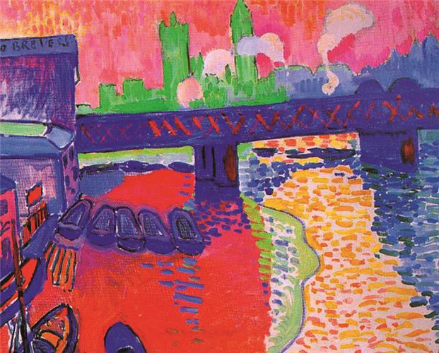 Derain, André, francuski slikar i grafičar (Chatou, 10. VI. 1880 – Garches, 8. IX. 1954). Studirao u atelijeru → Eugènea Carrièrea; s → Henrijem Matisseom, → Mauriceom Vlaminckom i dr. utemeljio grupu fovista kada slika pretežito krajolike u razbuktaloj harmoničnoj paleti boja (Hyde Park). Pod utjecajem Cézannnea i kubizma zaokupljen proučavanjem volumena; napušta fovizam i slika stilizirane krajolike, mrtve prirode, portrete, ženske aktove i sl. (Dvije sestre, Večera). Izrađuje keramiku, nacrte za kostime i scenografiju za pariška i londonska kazališta (→ Ottorino Respighi, La Boutique fantastique). Tehnikom drvoreza ilustrirao Apollinaireovu poetsku prozu Čarobnjak koji propada, Homerovu Ilijadu.