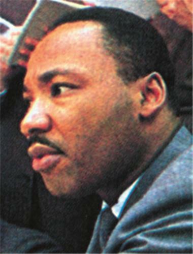 King, Martin Luther, afroamerički svećenik i političar (Atlanta, 15. I. 1929 – Memphis, 4. IV. 1968). Diplomirao teologiju. Baptistički pastor. Započeo nenasilnu kampanju za građanska prava u Montgomeryju (Alabama) i bojkot rasne segregacije u autobusima 1955– 56. Osnivač pokreta za nenasilnu borbu protiv diskriminacije 1957. Istaknuo se kao borac za prava crnaca u SAD-u, zagovarao građansku neposlušnost i nenasilje. Nobelova nagrada za mir 1964. Ubijen u atentatu u Memphisu 1968, koji je izazvao pobune Afroamerikanaca širom zemlje.