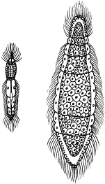 mezozoa, Rhopalura, mužjak (lijevo); ženka (desno)