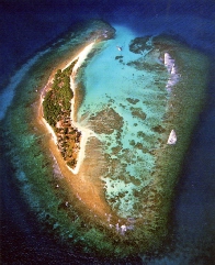 atol (malajski atolu unutra), → koraljni greben koji zatvara → lagunu. Atoli se mogu sastojati od nizova grebena koji nisu uvijek polukružni, ali općenito tvore polukružan ili prstenast, manje ili više pravilan oblik, i do nekoliko desetaka km u promjeru, 2–4 m iznad morske razine, koji zatvara razmjerno plitku lagunu. Nastaju u morima pogodnim za rast koralja, kao koraljni greben oko nekog otoka, najčešće vulkanskog podrijetla, koji se postupno spušta pod morsku razinu. Kako se otok spušta, koralji rastu jedni na drugima; rubni koraljni greben prelazi u barijerni koraljni greben. Kada otok potpuno potone, ostane samo prstenast koraljni greben sa središnjom lagunom.